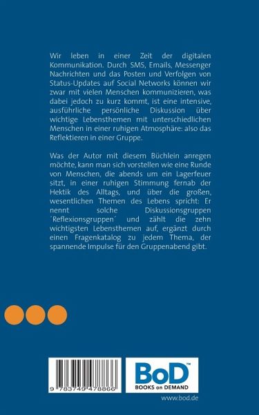 Wir leben in einer Zeit der digitalen Kommunikation. Durch SMS, Emails, Messenger Nachrichten und das Posten und Verfolgen von Status-Updates auf Social Networks können wir zwar mit vielen Menschen kommunizieren, was dabei jedoch zu kurz kommt, ist eine intensive, ausführliche persönliche Diskussion über wichtige Lebensthemen mit unterschiedlichen Menschen in einer ruhigen Atmosphäre: also das Reflektieren in einer Gruppe.Was der Autor mit diesem Büchlein anregen möchte, kann man sich vorstellen wie eine Runde von Menschen, die abends um ein Lagerfeuer sitzt, in einer ruhigen Stimmung fernab der Hektik des Alltags, und über die großen, wesentlichen Themen des Lebens spricht: Er nennt solche Diskussionsgruppen ´Reflexionsgruppen´ und zählt die zehn wichtigsten Lebensthemen auf, ergänzt durch einen Fragenkatalog zu jedem Thema, der spannende Impulse für den Gruppenabend gibt.