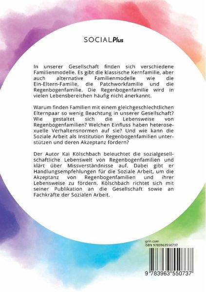In unserer Gesellschaft finden sich verschiedene Familienmodelle. Es gibt die klassische Kernfamilie, aber auch alternative Familienmodelle wie die Ein-Eltern-Familie, die Patchworkfamilie und die Regenbogenfamilie. Die Regenbogenfamilie wird in vielen Lebensbereichen häufig nicht anerkannt.Warum finden Familien mit einem gleichgeschlechtlichen Elternpaar so wenig Beachtung in unserer Gesellschaft? Wie gestaltet sich die Lebensweise von Regenbogenfamilien? Welchen Einfluss haben heterosexuelle Verhaltensnormen auf sie? Und wie kann die Soziale Arbeit als Institution Regenbogenfamilien unterstützen und deren Akzeptanz fördern?Der Autor Kai Kölschbach beleuchtet die sozialgesellschaftliche Lebenswelt von Regenbogenfamilien und klärt über Missverständnisse auf. Dabei gibt er Handlungsempfehlungen für die Soziale Arbeit, um die Akzeptanz von Regenbogenfamilien und ihrer Lebensweise zu fördern. Kölschbach richtet sich mit seiner Publikation an die Gesellschaft sowie an Fachkräfte der Sozialen Arbeit.Aus dem Inhalt:- Wahlfamilie;- Diskriminierung;- Lebenspartnerschaftsgesetz;- Queerfamily;- Heteronormativität