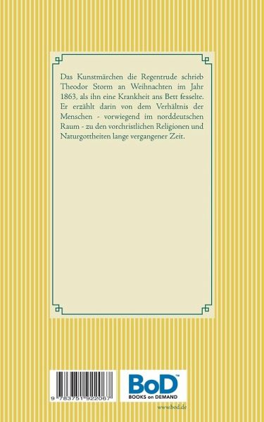 Das Kunstmärchen die Regentrude schrieb Theodor Storm an Weihnachten im Jahr 1863, als ihn eine Krankheit ans Bett fesselte. Er thematisiert darin das Verhältnis der Menschen vorwiegend im norddeutschen Raum zu ihren vorchristlichen Religionen und Naturgottheiten lange vergangener Zeit.
