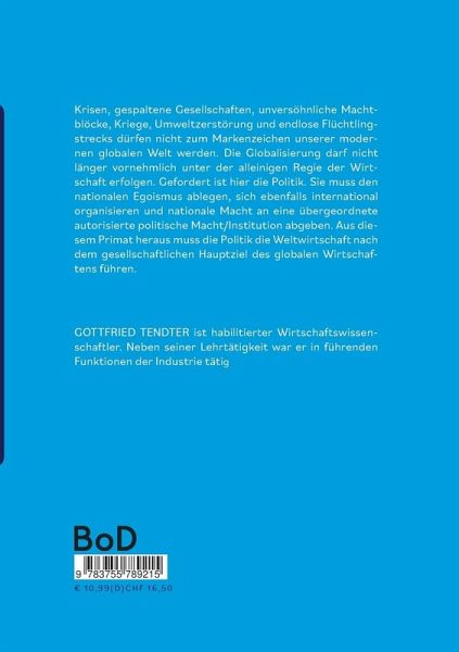Krisen, gespaltene Gesellschaften, unversöhnliche Machtblöcke, Kriege, Umweltzerstörung und endlose Flüchtlingstrecks dürfen nicht zum Markenzeichen unserer modernen globalen Welt werden. Die Globalisierung darf nicht länger vornehmlich unter der alleinigen Regie der Wirtschaft erfolgen. Gefordert ist hier die Politik. Sie muss den nationalen Egoismus ablegen, sich ebenfalls international organisieren und nationale Macht an eine übergeordnete autorisierte politische Macht/Institution abgeben. Aus diesem Primat heraus muss die Politik die Weltwirtschaft nach dem gesellschaftlichen Hauptziel des globalen Wirtschaftens führen.