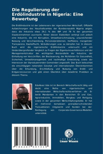 Die Erdölindustrie ist der Lebensnerv der nigerianischen Wirtschaft. Offizielle Aufzeichnungen des Haushaltsamtes der Bundesrepublik Nigeria zeigen, dass die Industrie etwa 29,1 % des BIP und 78 % der gesamten Staatseinnahmen ausmacht. Hinter diesen Statistiken verbirgt sich jedoch eine Industrie, die mit Korruption, Umweltverschmutzung, unzureichender Nutzung und Verschwendung, Personalproblemen, Ineffizienz, mangelnder Transparenz, Kapitalflucht, Veräußerungen usw. zu kämpfen hat. In diesem Buch wird die nigerianische Erdölindustrie untersucht und ein länderübergreifender Vergleich zu Fragen der Eigentumsverhältnisse und der Managementstruktur der wichtigsten Bestandteile der Industrie, der Einhaltung von Vorschriften, der Besteuerung, der Richtlinien für Gesundheit, Sicherheit, Umweltmanagement und nachhaltige Entwicklung sowie der Interessen der ölproduzierenden Gemeinden angestellt. Das Buch beleuchtet die einschlägigen nationalen Gesetze und internationalen Übereinkommen über die Erkundung, Erschließung und Nutzung von Erdöl- und Erdgasressourcen und gibt einen Überblick über bewährte Praktiken zu diesem Thema.