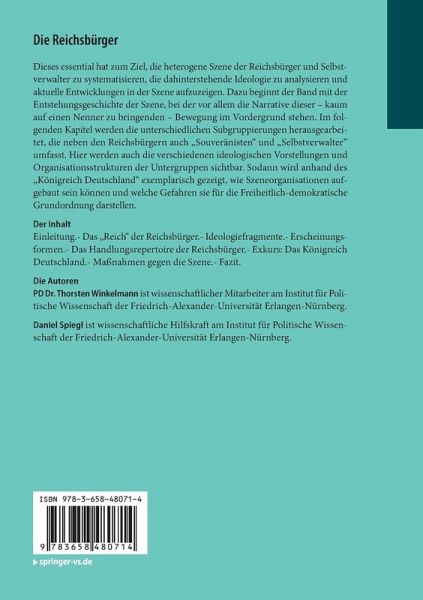 Dieses essential hat zum Ziel, die heterogene Szene der Reichsbürger und Selbstverwalter zu systematisieren, die dahinterstehende Ideologie zu analysieren und aktuelle Entwicklungen in der Szene aufzuzeigen. Dazu beginnt der Band mit der Entstehungsgeschichte der Szene, bei der vor allem die Narrative dieser - kaum auf einen Nenner zu bringenden - Bewegung im Vordergrund stehen. Im folgenden Kapitel werden die unterschiedlichen Subgruppierungen herausgearbeitet, die neben den Reichsbürgern auch "Souveränisten" und "Selbstverwalter" umfasst. Hier werden auch die verschiedenen ideologischen Vorstellungen und Organisationsstrukturen der Untergruppen sichtbar. Sodann wird anhand des "Königreich Deutschland" exemplarisch gezeigt, wie Szeneorganisationen aufgebaut sein können und welche Gefahren sie für die Freiheitlich-demokratische Grundordnung darstellen.