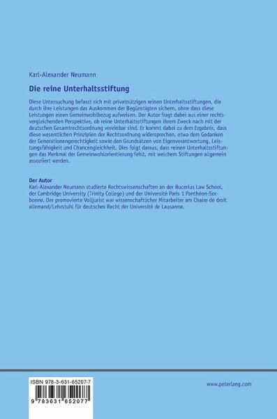 Diese Untersuchung befasst sich mit privatnützigen reinen Unterhaltsstiftungen, die durch ihre Leistungen das Auskommen der Begünstigten sichern, ohne dass diese Leistungen einen Gemeinwohlbezug aufweisen. Der Autor fragt dabei aus einer rechtsvergleichenden Perspektive, ob reine Unterhaltsstiftungen ihrem Zweck nach mit der deutschen Gesamtrechtsordnung vereinbar sind. Er kommt dabei zu dem Ergebnis, dass diese wesentlichen Prinzipien der Rechtsordnung widersprechen, etwa dem Gedanken der Generationengerechtigkeit sowie den Grundsätzen von Eigenverantwortung, Leistungsfähigkeit und Chancengleichheit. Dies folgt daraus, dass reinen Unterhaltsstiftungen das Merkmal der Gemeinwohlorientierung fehlt, mit welchem Stiftungen allgemein assoziiert werden.