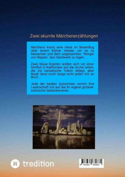 Die beiden satirischen Märchen haben sehr unterschiedliche Schauplätze. In `Hexerei im Altenheim` kreist Salominka Gaukel nächtens per Besen über der Stadt, um ihr Veedel zu bewachen und sich den sogenannten ´Würger von Nippes` zu schnappen. Man kann die Geschichte als ´Köln-Krimi der besonderen Art` ansehen. In der titelgebenden ´Reise der blauen Kojoten` geht es um die Flucht eines Kojotenpaars vor der nächsten Sintflut. Die Arche soll die Tiere ins kanadische Yukon retten, doch Noah nimmt noch lange nicht jeden mit. Die blauen Kojoten sind ihm vom letzten Mal her als üble Schurken in Erinnerung. Wenn sie dieses Mal dabei sein wollen, müssen sie tricksen. Letzteres liegt ihnen allerdings im Blut ... Die Story ist als Parodie auf Fantasy gedacht, doch wer das Genre mag, kann sie durchaus auch ohne Hintergedanken genießen.