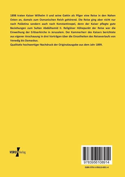1898 traten Kaiser Wilhelm II und seine Gattin als Pilger eine Reise in den Nahen Osten an, damals zum Osmanischen Reich gehörend. Die Reise ging aber nicht nur nach Palästina sondern auch nach Konstantinopel, denn der Kaiser pflegte gute Beziehungen zum Sultan Abdülhamid II. Religiöser Höhepunkt der Reise war die Einweihung der Erlöserkirche in Jerusalem. Der Kammerherr des Kaisers berichtete aus eigener Anschauung in drei Vorträgen über die Einzelheiten des Reiseverlaufs von Venedig bis Damaskus.