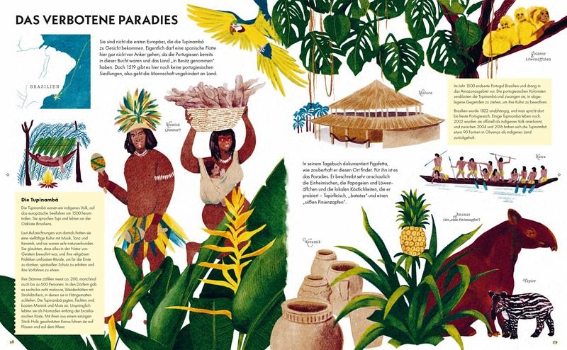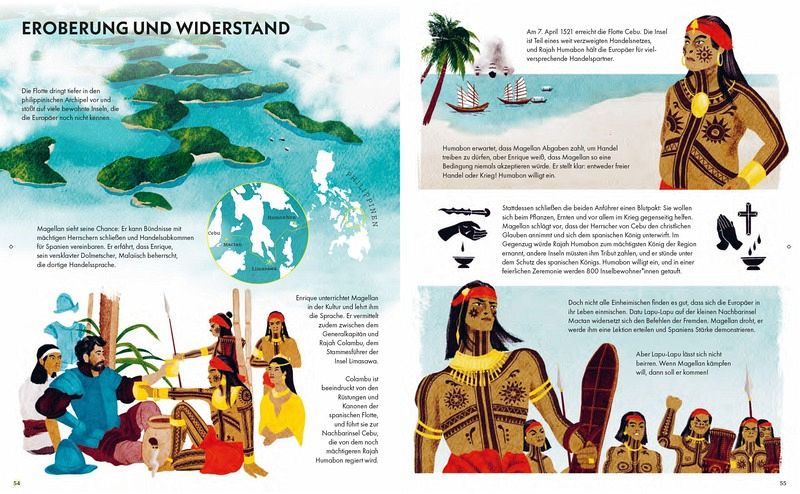 Die Reise, die bewies, dass die Erde rund ist Der Wettlauf um die schnellste Route zu den Gewürzinseln hat begonnen und eine mutige Expedition ist dabei, Geschichte zu schreiben. Dieses außergewöhnliche Sachbilderbuch folgt Ferdinand Magellans Reise um die Erde - und wirft ein Licht auf die Menschen, die sie mitgestaltet haben, darunter Enrique de Malacca, der malaiische Dolmetscher, dessen Geschichte viel zu lange unerwähnt geblieben ist. Mit eindrucksvollen Illustrationen führt es durch stürmische Meere und fremde Länder, berichtet von riskanten Begegnungen und enthüllt die Triumphe und Spannungen der ersten Weltumsegelung. Dabei regt es Kinder dazu an, kritisch über Imperien, Entdeckungsreisen und diejenigen nachzudenken, die in der Geschichte allzu oft ungehört bleiben. Es ist eine perfekte Lektüre für alle, die bereit sind, über den Tellerrand des Lehrbuchs hinauszuschauen und einen Blick in die reale Vergangenheit zu werfen. Ausstattung: mit Sonderfarben gedruckt und floral gemustertem Überzugsmaterial