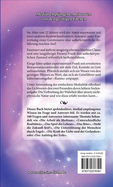 Im Alter von 22 Jahren wird der Autor unerwartet mit einer anderen Realität konfrontiert, indem er unter Einwirkung eines Geistwesens eine außerkörperliche Erfahrung machen darf.Fasziniert und äußerst neugierig erlernen Matthias Clauss und sein langjähriger Freund Frank den außerkörperlichen Zustand willentlich herbeizuführen.Einige Jahre später experimentiert Frank mit erweiterten Bewusstseinszuständen mit dem Ziel, Kontakt zu Gott aufzunehmen. Plötzlich meldet sich ein Wesen von den geistigen Ebenen zu Wort, das sich als Geistführer und Informationsgeber 'Ramta' entpuppt.Unter Anwendung der entdeckten Medialität offenbart das Lichtwesen den zwei Freunden deren höhere Seelenaufgabe: Die Verbreitung der Wahrheit über unsere nichtphysische Natur und wie diese erlebt werden kann.Dieses Buch bietet spektakuläres, medial empfangenes Wissen im Frage und Antwort-Stil. Es werden mit ca. 160 Fragen und Antworten interessante Themata behandelt wie 'Die Arbeit als Medium', 'Unterschiedliche Realitäten', 'Das Spiel des Lebens', 'Das Böse', 'Steht die Zukunft fest?', 'Die Unterstützung der Menschen durch Engel', 'Die Kraft der Liebe und der Gedanken' oder 'Der Aufstieg der Erde'.