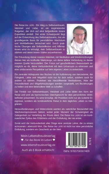 Die Reise ins Licht - Ein Weg zu Selbstvertrauen, Weisheit und Liebe, ist ein inspirierender Ratgeber, der dich auf eine tiefgreifende innere Expedition einlädt. Der erste Schwerpunkt liegt auf der Entwicklung des Selbstvertrauens, das als grundlegende Basis für persönliches Wachstum und Wohlbefinden betrachtet wird. Durch praktische Übungen wie Selbstreflexion und Affirmationen wirst du ermutigt, dein Selbstvertrauen zu stärken und deine innere Stärke anzuerkennen.Die Erkundung deiner inneren Weisheit, mit Meditation und Intuitionsübungen dienen hier als kraftvolle Werkzeuge, um deine tiefere Verbindung zu deiner inneren Quelle herzustellen. Der Fokus auf ganzheitlichem Bewusstsein ermöglicht es dir, deine Verbundenheit mit dem Universum zu erkennen und eine umfassende Perspektive auf dein eigenes Leben zu entwickeln.Ein zentraler Höhepunkt des Buches ist die Kultivierung von Herzwärme, der Fähigkeit, Liebe und Mitgefühl nicht nur für dich selbst, sondern auch für andere zu nähren. Praktiken wie Herzöffnende Meditationen, Akte der Freundlichkeit und Mitgefühlsübungen werden vorgestellt, um Beziehungen zu heilen und eine liebevollere Welt zu schaffen.Die Trinität von Selbstvertrauen, Weisheit und Liebe bildet den Kern der Reise und wird als harmonisches Gleichgewicht für dein persönliches Wohlbefinden präsentiert. Du wirst ermutigt, die Praktiken nicht nur als isolierte Ereignisse, sondern als kontinuierliche Reise in dein tägliches Leben zu integrieren.Herausforderungen und Widerstände werden als natürlicher Bestandteil des Wachstumsprozesses betont, wobei jeder Moment der Schwierigkeit als Gelegenheit zur Vertiefung der Praxis dient. Die Reise ins Licht ist ein kontinuierlicher Zyklus des Erblühens und der Entfaltung, der nie endet.Somit wird die Verbundenheit aller Dinge eine zentrale Lehre, die zu einem achtsamen Lebensstil führt. Die Reise ins Licht ist nicht nur eine persönliche Entfaltung, sondern ein Geschenk an die Welt.