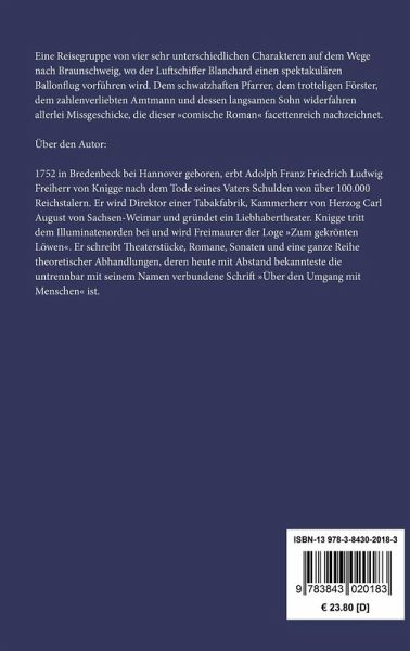Adolph Freiherr von Knigge: Die Reise nach Braunschweig Eine Reisegruppe von vier sehr unterschiedlichen Charakteren auf dem Wege nach Braunschweig, wo der Luftschiffer Blanchard einen spektakulären Ballonflug vorführen wird. Dem schwatzhaften Pfarrer, dem trotteligen Förster, dem zahlenverliebten Amtmann und dessen langsamen Sohn widerfahren allerlei Missgeschicke, die dieser »comische Roman« facettenreich nachzeichnet. Erstdruck: Hannover 1792. Vollständige Neuausgabe mit einer Biographie des Autors. Herausgegeben von Karl-Maria Guth. Berlin 2013. Textgrundlage ist die Ausgabe: Adolph Freiherr von Knigge: Die Reise nach Braunschweig. Nach der Erstausgabe herausgegeben von Paul Raabe, Kassel: Georg Wenderoth, 1972. Die Paginierung obiger Ausgabe wird in dieser Neuausgabe als Marginalie zeilengenau mitgeführt. Umschlaggestaltung von Thomas Schultz-Overhage unter Verwendung des Bildes: Ballonfahrt des Franzosen Blanchard am 27. September 1788 in Berlin, Unbekannter zeitgenössischer Graphiker. Gesetzt aus Minion Pro, 11 pt. Über den Autor: 1752 in Bredenbeck bei Hannover geboren, erbt Adolph Franz Friedrich Ludwig Freiherr von Knigge nach dem Tode seines Vaters Schulden von über 100.000 Reichstalern. Er wird Direktor einer Tabakfabrik, Kammerherr von Herzog Carl August von Sachsen-Weimar und gründet ein Liebhabertheater. Knigge tritt dem Illuminatenorden bei und wird Freimaurer der Loge »Zum gekrönten Löwen«. Er schreibt Theaterstücke, Romane, Sonaten und eine ganze Reihe theoretischer Abhandlungen, deren heute mit Abstand bekannteste die untrennbar mit seinem Namen verbundene Schrift »Über den Umgang mit Menschen« ist.
