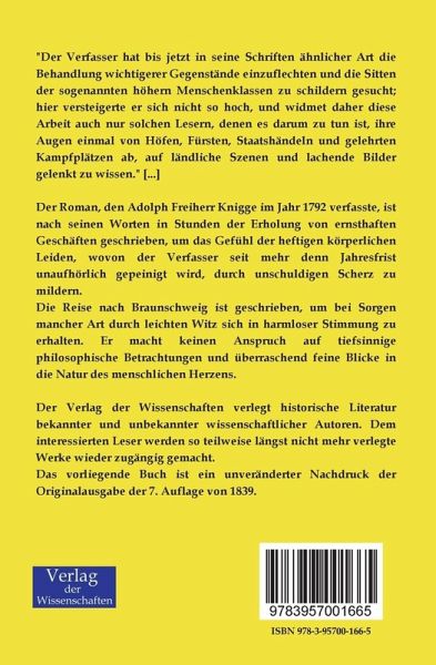 Die Reise nach Braunschweig ist geschrieben, um bei Sorgen mancher Art durch leichten Witz sich in harmloser Stimmung zu erhalten. Er macht keinen Anspruch auf tiefsinnige philosophische Betrachtungen und überraschend feine Blicke in die Natur des menschlichen Herzens.