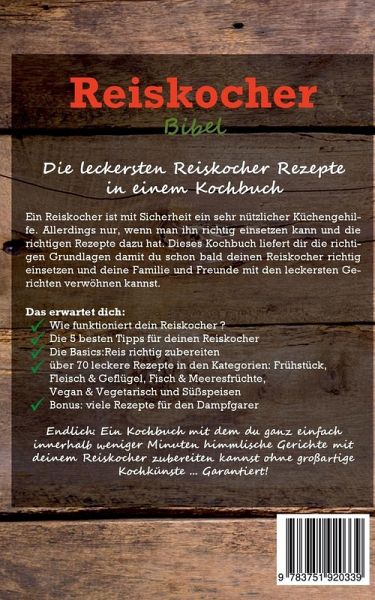 Ein Reiskocher ist mit Sicherheit ein sehr nützlicher Küchengehilfe. Allerdings nur, wenn man ihn richtig einsetzen kann und die richtigen Rezepte dazu hat. Dieses Kochbuch liefert dir die richtigen Grundlagen damit du schon bald deinen Reiskocher richtig einsetzen und deine Familie und Freunde mit den leckersten Gerichten verwöhnen kannst.Das erwartet dich:- Wie funktioniert dein Reiskocher ?- Die 5 besten Tipps für deinen Reiskocher- Die Basics:Reis richtig zubereiten- über 70 leckere Rezepte in den Kategorien: Frühstück,Fleisch & Geflügel, Fisch & Meeresfrüchte, Vegan & Vegetarisch und Süßspeisen- Bonus: viele Rezepte für den DampfgarerEndlich: Ein Kochbuch mit dem du ganz einfach innerhalb weniger Minuten himmlische Gerichte mit deinem Reiskocher zubereiten kannst ohne großartige Kochkünste ... Garantiert!