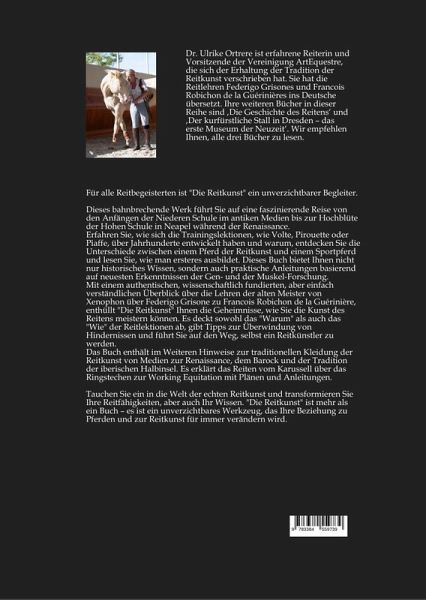 Für alle Reitbegeisterten ist "Die Reitkunst" ein unverzichtbarer Begleiter. Dieses bahnbrechende Werk führt Sie auf eine faszinierende Reise von den Anfängen der Niederen Schule im antiken Medien bis zur Hochblüte der Hohen Schule in Neapel während der Renaissance.Erfahren Sie, wie sich die Trainingslektionen, wie Volte, Pirouette oder Piaffe, über Jahrhunderte entwickelt haben und warum, entdecken Sie die Unterschiede zwischen einem Pferd der Reitkunst und einem Sportpferd und lesen Sie, wie man ersteres ausbildet. Dieses Buch bietet Ihnen nicht nur historisches Wissen, sondern auch praktische Anleitungen basierend auf neuesten Erkenntnissen der Gen- und der Muskel-Forschung. Mit einem authentischen, wissenschaftlich fundierten, aber einfach verständlichen Überblick über die Lehren der alten Meister von Xenophon über Federigo Grisone zu Francois Robichon de la Guérinière, enthüllt "Die Reitkunst" Ihnen die Geheimnisse, wie Sie die Kunst des Reitens meistern können. Es deckt sowohl das "Warum" als auch das "Wie" der Reitlektionen ab, gibt Tipps zur Überwindung von Hindernissen und führt Sie auf den Weg, selbst ein Reitkünstler zu werden.Das Buch enthält im Weiteren Hinweise zur traditionellen Kleidung der Reitkunst von Medien zur Renaissance, dem Barock und der Tradition der iberischen Halbinsel. Es erklärt das Reiten vom Karussell über das Ringstechen zur Working Equitation mit Plänen und Anleitungen. Tauchen Sie ein in die Welt der echten Reitkunst und transformieren Sie Ihre Reitfähigkeiten, aber auch Ihr Wissen. "Die Reitkunst" ist mehr als ein Buch - es ist ein unverzichtbares Werkzeug, das Ihre Beziehung zu Pferden und zur Reitkunst für immer verändern wird.