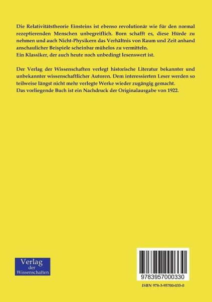 Aus den Rezensionen: "Allen interessierten Laien sehr zu empfehlen, die ohne höhere Mathematik tiefer in diese Materie eindringen möchten." (Weltraum-Facts mit Space-Informer, 2001) "Alle, die sich über eine rein populärwissenschaftliche Einführung hinaus für die Relativitätstheorie interessieren ... besonders Physikstudenten ... werden an dem eingehenden Werk Freude haben." (Der Sternenbote, 2001) "Die Erweiterung bereichert den Text von Born aber nicht nur um neuere Entwicklungen der Physik. Rückverweise verzahnen die neuen Kapitel inhaltlich mit den vorstehenden Überlegungen, und auch das Bornsche Projekt, für den mit Schulmathemaitk und einem "gesunden Menschenverstand" ausgestatteten Leser verständlich zu sein, wird erfolgreich fortgeführt." (Wissenschaftlicher Literaturanzeiger, 2001) "Das Buch zeichnet sich in besonderm Maße gegenüber fast allen anderen Abhandlungen über dieses Thema dadurch aus, daß es in einer zuweilen geradezu brillianten Ausdrucksweise die Problematik der klassischen Physik und deren Hintergrund aufzeigt, die dann durch Einsteins Theorien eine Auflösung fand. [...] Alles in allem ein sehr lesenswertes Buch, jedoch kein populärwissenschaftliches und für den Laien sicherlich auch kein leichtes. Denn trotz der außerordentlich gut verständlichen Darstellungsweise Borns erfordert das Buch außer etwas Grundlagen-Mathematik ein hohes Maß an Aufmerksamkeit und die bereitschaft, physikalsiche Sachverhalte gedanklich zu durchdringen. Es ist mit sicherheit ein Verdienst von Herausgebern und Verlag, Borns Buch durch die Neuauflage mit den aktuellen Ergänzungen wieder einer interessierten Leserschaft verfügbar zu machen." (Nachrichten der Olbers-Gesellschaft, 2001)