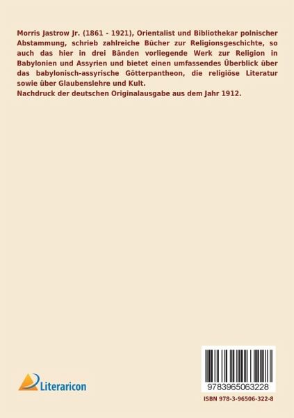 Morris Jastrow Jr. (1861 - 1921), Orientalist und Bibliothekar polnischer Abstammung, schrieb zahlreiche Bücher zur Religionsgeschichte, so auch das hier in drei Bänden vorliegende Werk zur Religion in Babylonien und Assyrien und bietet einen umfassendes Überblick über das babylonisch-assyrische Götterpantheon, die religiöse Literatur sowie über Glaubenslehre und Kult.