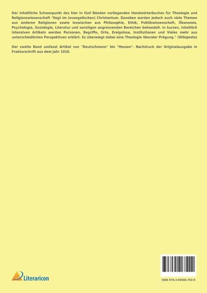Der inhaltliche Schwerpunkt des hier in fünf Bänden vorliegenden Handwörterbuches für Theologie und Religionswissenschaft "liegt im (evangelischen) Christentum. Daneben werden jedoch auch viele Themen aus anderen Religionen sowie inzwischen aus Philosophie, Ethik, Politikwissenschaft, Ökonomie, Psychologie, Soziologie, Literatur und sonstigen angrenzenden Bereichen behandelt. In kurzen, inhaltlich intensiven Artikeln werden Personen, Begriffe, Orte, Ereignisse, Institutionen und Vieles mehr aus unterschiedlichen Perspektiven erklärt. Es überwiegt dabei eine Theologie liberaler Prägung." (Wikipedia) Der zweite Band umfasst Artikel von "Deutschmann" bis "Hessen". Nachdruck der Originalausgabe in Frakturschrift aus dem Jahr 1910.