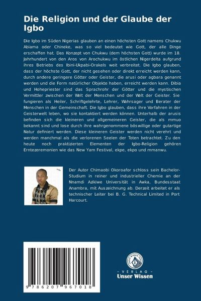 Die Igbo im Süden Nigerias glauben an einen höchsten Gott namens Chukwu Abiama oder Chineke, was so viel bedeutet wie Gott, der alle Dinge erschaffen hat. Das Konzept von Chukwu (dem höchsten Gott) wurde im 18. Jahrhundert von den Aros von Arochukwu im östlichen Nigerdelta aufgrund ihres Betriebs des Ibini-Ukpabi-Orakels weit verbreitet. Die Igbo glauben, dass der höchste Gott, der nicht gesehen oder direkt erreicht werden kann, durch andere geringere Götter oder Geister, die arusi oder agbara genannt werden und die Form natürlicher Objekte haben, erreicht werden kann. Dibia und Hohepriester sind das Sprachrohr der Götter und die mystischen Vermittler zwischen der Welt der Menschen und der Welt der Geister. Sie fungieren als Heiler, Schriftgelehrte, Lehrer, Wahrsager und Berater der Menschen in der Gemeinschaft. Die Igbo glauben, dass ihre Vorfahren in der Geisterwelt leben, wo sie kontaktiert werden können. Unterhalb der arusis befinden sich die kleineren und allgemeineren Geister, die als mmuo bekannt sind und lose durch ihre wahrgenommene böswillige oder gutartige Natur definiert werden. Diese kleineren Geister werden nicht verehrt und werden manchmal als die verlorenen Seelen der Toten betrachtet. Zu den heute noch praktizierten Elementen der Igbo-Religion gehören Erntezeremonien wie das New Yam Festival, ekpe, ekpo und mmanwu.