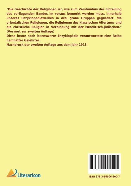 "Die Geschichte der Religionen ist, wie zum Verständnis der Einteilung des vorliegenden Bandes im voraus bemerkt werden muss, innerhalb unseres Enzyklopädiewerkes in drei große Gruppen gegliedert: die orientalischen Religionen, die Religionen des klassischen Altertums und die christliche Religion in Verbindung mit der israelitisch-jüdischen." (Vorwort zur zweiten Auflage) Diese heute noch lesenswerte Enzyklopädie verantwortete eine Reihe namhafter Gelehrter. Nachdruck der zweiten Auflage aus dem Jahr 1913.