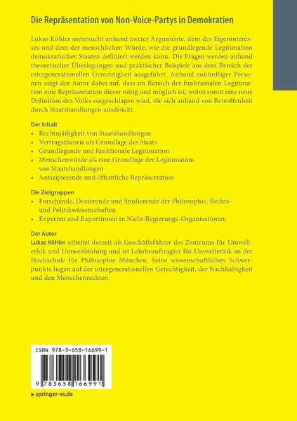 Lukas Köhler untersucht anhand zweier Argumente, dem des Eigeninteresses und dem der menschlichen Würde, wie die grundlegende Legitimation demokratischer Staaten definiert werden kann. Die Fragen werden anhand theoretischer Überlegungen und praktischer Beispiele aus dem Bereich der intergenerationellen Gerechtigkeit ausgeführt. Anhand zukünftiger Personen zeigt der Autor dabei auf, dass im Bereich der funktionalen Legitimation eine Repräsentation dieser nötig und möglich ist, wobei somit eine neue Definition des Volks vorgeschlagen wird, die sich anhand von Betroffenheit durch Staatshandlungen ausdrückt.