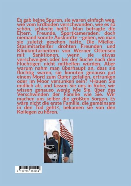 Es gab keine Spuren, sie waren einfach weg, wie vom Erdboden verschwunden, wie es so schön, schlecht heißt. Man befragte die Eltern, Freunde, Sportkameraden, doch niemand konnte Auskünfte --geben, wo man sie zuletzt gesehen hatte. Die Mielke-Stasimitarbeiter drohten Freunden und Klinikmitarbeitern von Werner Ottensen mit Sanktionen, wenn sie etwas verschweigen oder bei der Suche nach den Flüchtigen nicht mithelfen würden. Aber warum nahm man überhaupt an, dass sie flüchtig waren, sie konnten genauso gut einem Mord zum Opfer gefallen, ertrunken oder im Moor versunken sein? >Hauen Sie endlich ab, und lassen Sie uns in Ruhe, wir wissen genauso wenig wie Sie, über das Verschwinden der Familie wie Sie. Wir machen uns selber die größten Sorgen. Es wäre nicht die erste Familie, die gemeinsam in den Tod geht<, bekamen sie von den Kollegen zu hören.