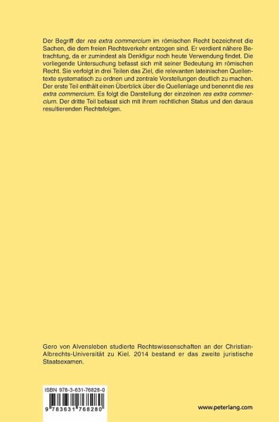 Der Begriff der res extra commercium im römischen Recht bezeichnet die Sachen, die dem freien Rechtsverkehr entzogen sind. Er verdient nähere Betrachtung, da er zumindest als Denkfigur noch heute Verwendung findet. Die vorliegende Untersuchung befasst sich mit seiner Bedeutung im römischen Recht. Sie verfolgt in drei Teilen das Ziel, die relevanten lateinischen Quellentexte systematisch zu ordnen und zentrale Vorstellungen deutlich zu machen. Der erste Teil enthält einen Überblick über die Quellenlage und benennt die res extra commercium. Es folgt die Darstellung der einzelnen res extra commercium. Der dritte Teil befasst sich mit ihrem rechtlichen Status und den daraus resultierenden Rechtsfolgen.