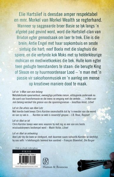Elie Hartslief is deesdae amper respektabel en mnr. Morkel van Morkel Wealth se regterhand. Wanneer sy saggeaarde broer Basie se lyk langs 'n afgeleë pad gevind word, word die Hartslief-clan van Brixton egter genoodsaak om laer te trek. Elie is die brein; Antie Engel met haar sopkombuis en sesde sintuig die hart; neef Boela met die slaghuis die spiere; en die verfynde kok Moks met sy helderkleurige mohican en mediwietkoekies die bek. Hulle kom egter teen gedugte teenstanders te staan: die berugte King of Sleaze en sy huurmoordenaar Lood - 'n man met 'n passie vir saksofoonmusiek en 'n aanleg om mense op kreatiewe maniere dood te maak.