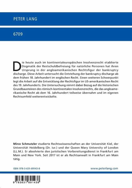 Die heute auch im kontinentaleuropäischen Insolvenzrecht etablierte Dogmatik der Restschuldbefreiung für natürliche Personen hat ihren Ursprung in der angloamerikanischen Rechtsfigur der bankruptcy discharge. Diese Arbeit untersucht die Entstehung der bankruptcy discharge ab dem frühen 18. Jahrhundert im englischen Recht. Einen weiteren Schwerpunkt legt die Arbeit auf die Entwicklung der Rechtsfigur im US-amerikanischen Recht des 19. Jahrhunderts. Die Untersuchung nimmt dabei Bezug auf die historischen Grundbausteinen des römisch-kontinentalen Insolvenzrechts, die das angloamerikanische Recht ab dem 16. Jahrhundert teilweise übernahm und im eigenen Rechtsumfeld weiterentwickelte.