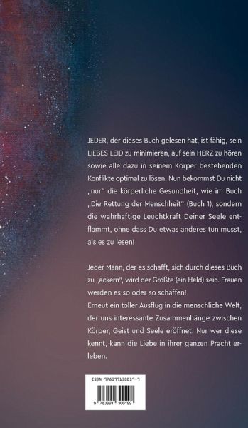 JEDER, der dieses Buch gelesen hat, ist fähig, sein LIEBES-LEID zu minimieren, auf sein HERZ zu hören sowie alle dazu in seinem Körper bestehenden Konflikte optimal zu lösen. Nun bekommst Du nicht "nur" die körperliche Gesundheit, wie im Buch "Die Rettung der Menschheit" (Buch 1), sondern die wahrhaftige Leuchtkraft Deiner Seele entflammt, ohne dass Du etwas anderes tun musst, als es zu lesen!Jeder Mann, der es schafft, sich durch dieses Buch zu "ackern", wird der Größte (ein Held) sein. Frauen werden es so oder so schaffen!Erneut ein toller Ausflug in die menschliche Welt, der uns interessante Zusammenhänge zwischen Körper, Geist und Seele eröffnet. Nur wer diese kennt, kann die Liebe in ihrer ganzen Pracht erleben.