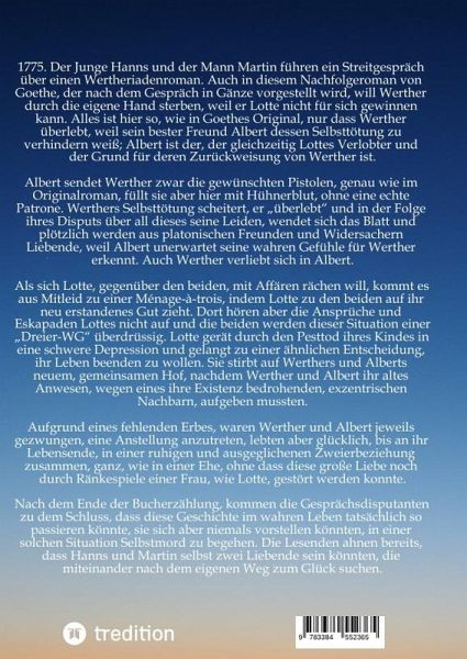 1775. Der Junge Hanns und der Mann Martin führen ein Streitgespräch über einen Wertheriadenroman. Auch in diesem Nachfolgeroman von Goethe, der nach dem Gespräch in Gänze vorgestellt wird, will Werther durch die eigene Hand sterben, weil er Lotte nicht für sich gewinnen kann. Alles ist hier so, wie in Goethes Original, nur dass Werther überlebt, weil sein bester Freund Albert dessen Selbsttötung zu verhindern weiß; Albert ist der, der gleichzeitig Lottes Verlobter und der Grund für deren Zurückweisung von Werther ist.Albert sendet Werther zwar die gewünschten Pistolen, genau wie im Originalroman, füllt sie aber hier mit Hühnerblut, ohne eine echte Patrone. Werthers Selbsttötung scheitert, er "überlebt" und in der Folge ihres Disputs über all dieses seine Leiden, wendet sich das Blatt und plötzlich werden aus platonischen Freunden und Widersachern Liebende, weil Albert unerwartet seine wahren Gefühle für Werther erkennt. Auch Werther verliebt sich in Albert.Als sich Lotte, gegenüber den beiden, mit Affären rächen will, kommt es aus Mitleid zu einer Ménage-à-trois, indem Lotte zu den beiden auf ihr neu erstandenes Gut zieht. Dort hören aber die Ansprüche und Eskapaden Lottes nicht auf und die beiden werden dieser Situation einer "Dreier-WG" überdrüssig. Lotte gerät durch den Pesttod ihres Kindes in eine schwere Depression und gelangt zu einer ähnlichen Entscheidung, ihr Leben beenden zu wollen. Sie stirbt auf Werthers und Alberts neuem, gemeinsamen Hof, nachdem Werther und Albert ihr altes Anwesen, wegen eines ihre Existenz bedrohenden, exzentrischen Nachbarn, aufgeben mussten.Aufgrund eines fehlenden Erbes, waren Werther und Albert jeweils gezwungen, eine Anstellung anzutreten, lebten aber glücklich, bis an ihr Lebensende, in einer ruhigen und ausgeglichenen Zweierbeziehung zusammen, ganz, wie in einer Ehe, ohne dass diese große Liebe noch durch Ränkespiele einer Frau, wie Lotte, gestört werden konnte.Nach dem Ende der Bucherzählung, kommen die Gesprächsdisputanten zu dem Schluss, dass diese Geschichte im wahren Leben tatsächlich so passieren könnte, sie sich aber niemals vorstellen könnten, in einer solchen Situation Selbstmord zu begehen. Die Lesenden ahnen bereits, dass Hanns und Martin selbst zwei Liebende sein könnten, die miteinander nach dem eigenen Weg zum Glück suchen.
