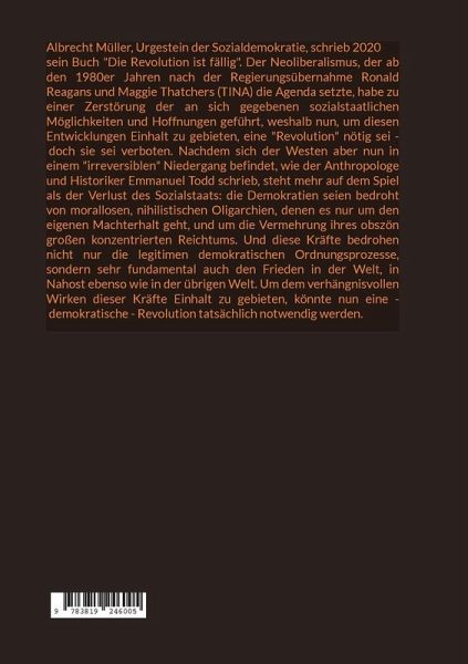 Albrecht Müller, Urgestein der Sozialdemokratie, schrieb 2020 sein Buch "Die Revolution ist fällig". Der Neoliberalismus, der ab den 1980er Jahren nach der Regierungsübernahme Ronald Reagans und Maggie Thatchers (TINA) die Agenda setzte, habe zu einer Zerstörung der an sich gegebenen sozialstaatlichen Möglichkeiten und Hoffnungen geführt, weshalb nun, um diesen Entwicklungen Einhalt zu gebieten, eine "Revolution" nötig sei - doch sie sei verboten. Nachdem sich der Westen aber nun in einem "irreversiblen" Niedergang befindet, wie der Anthropologe und Historiker Emmanuel Todd schrieb, steht mehr auf dem Spiel als der Verlust des Sozialstaats: die Demokratien seien bedroht von morallosen, nihilistischen Oligarchien, denen es nur um den eigenen Machterhalt geht, und um die Vermehrung ihres obszön großen konzentrierten Reichtums. Und diese Kräfte bedrohen nicht nur die legitimen demokratischen Ordnungsprozesse, sondern sehr fundamental auch den Frieden in der Welt, in Nahost ebenso wie in der übrigen Welt. Um dem verhängnisvollen Wirken dieser Kräfte Einhalt zu gebieten, könnte nun eine - demokratische - Revolution tatsächlich notwendig werden.