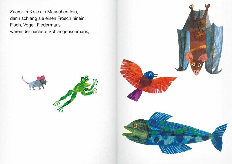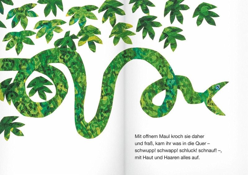 Der Bilderbuchklassiker über die unheimlich gefräßige Riesenschlange in humorvollen Reimen ist seit Generationen als Vorlesebuch beliebt. Wer der Schlange Sansibar in die Quere kommt, verschwindet in ihrem weit geöffneten Maul: zuerst Maus und Frosch, später Stachelschwein und Affe, am Ende Büffel und Elefant. Ungeheuer aufgebläht liegt sie nun in der Sonne und kann sich kaum noch rühren. In ihrem Inneren nimmt das »Geschubse und Gekrauche« dagegen immer mehr zu und bereitet ihr so große Übelkeit, dass sie urplötzlich all ihre Opfer wieder ausspeit. Die kleinen und großen Tiere, zehn an der Zahl, freuen sich über ihre Befreiung; aber die Schlange ist hungriger denn je. In ihrer Gier macht sie sich über den eigenen Schwanz her und frisst sich so selber auf.
