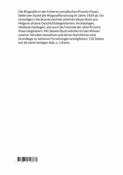 Die Ringwälle in der früheren preußischen Provinz Posen, bildet den Stand der Ringwallforschung im Jahre 1924 ab. Ein einmaliges Literaturverzeichnis zeichnet dieses Buch aus. Möge es all jene Geschichtsbegeisterten, Archäologen, Hobbyarchäologen, wie auch die Freunde der alten Provinz Posen begeistern. Mit diesem Buch möchte ich das Wissen unserer Vorväter bewahren und deren Nachfahren eine Grundlage zu weiteren Forschungen ermöglichen. 132 Seiten, mit 46 meist farbigen Abb. u. 1 Karte.