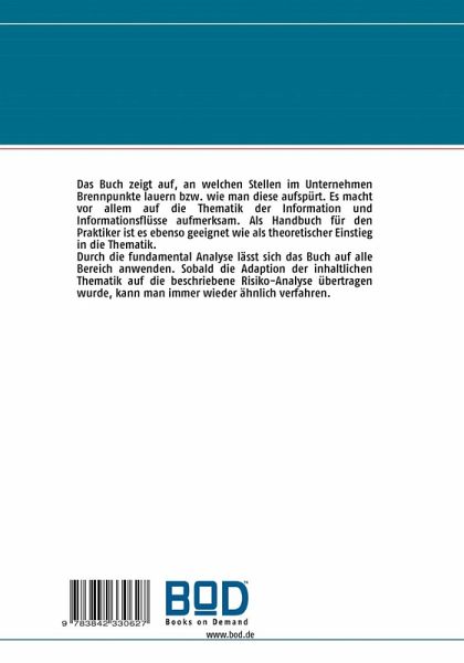 Das Buch zeigt auf, an welchen Stellen im Unternehmen Brennpunkte lauern bzw. wie man diese aufspürt. Es macht vor allem auf die Thematik der Information und Informationsflüsse aufmerksam. Als Handbuch für den Praktiker ist es ebenso geeignet wie als theoretischer Einstieg in die Thematik.Durch die fundamental Analyse lässt sich das Buch auf alle Bereich anwenden. Sobald die Adaption der inhaltlichen Thematik auf die beschriebene Risiko-Analyse übertragen wurde, kann man immer wieder ähnlich verfahren.