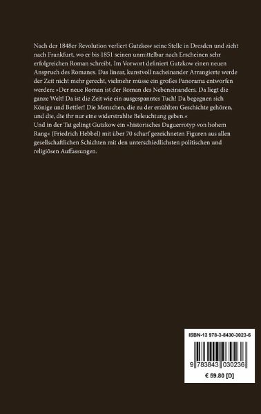 Karl Gutzkow: Die Ritter vom Geiste. Buch 1 bis 3 Nach der 1848er Revolution verliert Gutzkow seine Stelle in Dresden und zieht nach Frankfurt, wo er bis 1851 seinen unmittelbar nach Erscheinen sehr erfolgreichen Roman schreibt. Im Vorwort definiert Gutzkow einen neuen Anspruch des Romanes. Das linear, kunstvoll nacheinander Arrangierte werde der Zeit nicht mehr gerecht, vielmehr müsse ein großes Panorama entworfen werden: »Der neue Roman ist der Roman des Nebeneinanders. Da liegt die ganze Welt! Da ist die Zeit wie ein ausgespanntes Tuch! Da begegnen sich Könige und Bettler! Die Menschen, die zu der erzählten Geschichte gehören, und die, die ihr nur eine widerstrahlte Beleuchtung geben.« Und in der Tat gelingt Gutzkow ein »historisches Daguerrotyp von hohem Rang« (Friedrich Hebbel) mit über 70 scharf gezeichneten Figuren aus allen gesellschaftlichen Schichten mit den unterschiedlichsten politischen und religiösen Auffassungen. Erstdruck: Leipzig (Brockhaus) 1850/51. Vollständige Neuausgabe. Herausgegeben von Karl-Maria Guth. Berlin 2013. Textgrundlage ist die Ausgabe: Karl Ferdinand Gutzkow: Die Ritter vom Geiste. Roman in neun Büchern. [Band 1¿3] Herausgegeben von Thomas Neumann, Frankfurt a.M.: Zweitausendeins, 1998. Die Paginierung obiger Ausgabe wird in dieser Neuausgabe als Marginalie zeilengenau mitgeführt. Umschlaggestaltung von Thomas Schultz-Overhage unter Verwendung des Bildes: Unbekannter Künstler, Illustration zur Gründung des Templerordens durch Hugo von Payns und Gottfried von Saint-Omer, 13. Jahrhundert. Gesetzt aus Minion Pro, 11 pt.