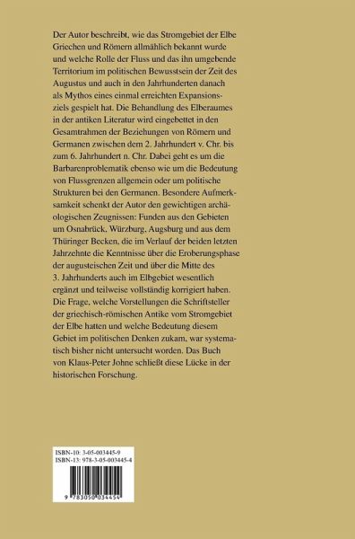 Die Frage, welche Vorstellungen die Schriftsteller der griechisch-römischen Antike vom Stromgebiet der Elbe hatten und welche Bedeutung diesem Gebiet im politischen Denken zukam, war systematisch bisher nicht untersucht worden. Das Buch von Klaus-Peter Johne schließt diese Lücke in der historischen Forschung.