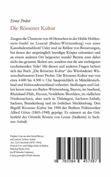 Zeugen die Überreste von 44 Menschen in der Höhle Hohlenstein-Stadel in Baden-Württemberg von einer Kannibalenmahlzeit? Oder sind sie Relikte von Bestattungen, bei denen der ursprünglich beerdigte Körper exhumiert und an einem anderen Ort beigesetzt wurde? Bettete man dabei nicht das gesamte Skelett um, sondern nur die wichtigsten Teile? Mit diesen und anderen Fragen befasst sich das Buch "Die Rössener Kultur" des Wiesbadener Wissenschaftsautors Ernst Probst. Die Rössener Kultur war von etwa 4.600 bis 4.300 v. Chr. hauptsächlich in Mitteldeutschland und Südwestdeutschland verbreitet. Siedlungen und Gräber kennt man aus Baden-Württemberg, Bayern, im Saarland, Rheinland-Pfalz, Hessen, Nordrhein-Westfalen, im südlichen Niedersachsen, aber auch in Thüringen, Sachsen-Anhalt, Sachsen, Brandenburg und im östlichen Mecklenburg. Den Begriff Rössener Kultur hat 1900 der Berliner Prähistoriker Alfred Götze (1865-1948) geprägt. Er erinnert an das Gräberfeld des Ortsteils Rössen von Leuna (Saalkreis) in Sachsen-Anhalt.