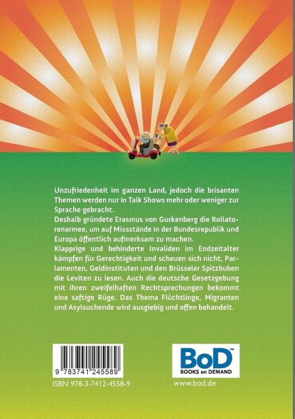 Unzufriedenheit im ganzen Land, jedoch die brisanten Themen werden nur in Talkshows mehr oder weniger zur Sprache gebracht. Deshalb gründete Erasmus von Gurkenberg die Rollatorenarmee, um auf Missstände in der Bundesrepublik und Europa öffentlich aufmerksam zu machen. Klapprige und behinderte Invaliden im Endzeitalter kämpfen für Gerechtigkeit und scheuen sich nicht Parlamenten, Geldinstitute und den Brüsseler Spitzbuben die Leviten zu lesen. Auch die deutsche Gesetzgebung, mit ihren zweifelhaften Rechtsprechungen, bekommt eine saftige Rüge. Das Thema Flüchtlinge, Migranten und Asylsuchende wird ausgiebig und offen behandelt.