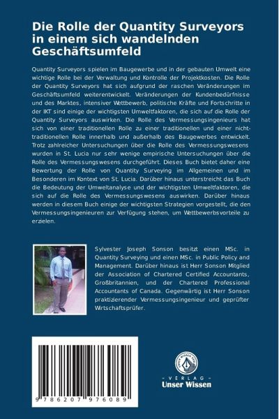 Quantity Surveyors spielen im Baugewerbe und in der gebauten Umwelt eine wichtige Rolle bei der Verwaltung und Kontrolle der Projektkosten. Die Rolle der Quantity Surveyors hat sich aufgrund der raschen Veränderungen im Geschäftsumfeld weiterentwickelt. Veränderungen der Kundenbedürfnisse und des Marktes, intensiver Wettbewerb, politische Kräfte und Fortschritte in der IKT sind einige der wichtigsten Umweltfaktoren, die sich auf die Rolle der Quantity Surveyors auswirken. Die Rolle des Vermessungsingenieurs hat sich von einer traditionellen Rolle zu einer traditionellen und einer nicht-traditionellen Rolle innerhalb und außerhalb des Baugewerbes entwickelt. Trotz zahlreicher Untersuchungen über die Rolle des Vermessungswesens wurden in St. Lucia nur sehr wenige empirische Untersuchungen über die Rolle des Vermessungswesens durchgeführt. Dieses Buch bietet daher eine Bewertung der Rolle von Quantity Surveying im Allgemeinen und im Besonderen im Kontext von St. Lucia. Darüber hinaus unterstreicht das Buch die Bedeutung der Umweltanalyse und der wichtigsten Umweltfaktoren, die sich auf die Rolle des Vermessungswesens auswirken. Darüber hinaus werden in diesem Buch einige der wichtigsten Strategien vorgestellt, die den Vermessungsingenieuren zur Verfügung stehen, um Wettbewerbsvorteile zu erzielen.