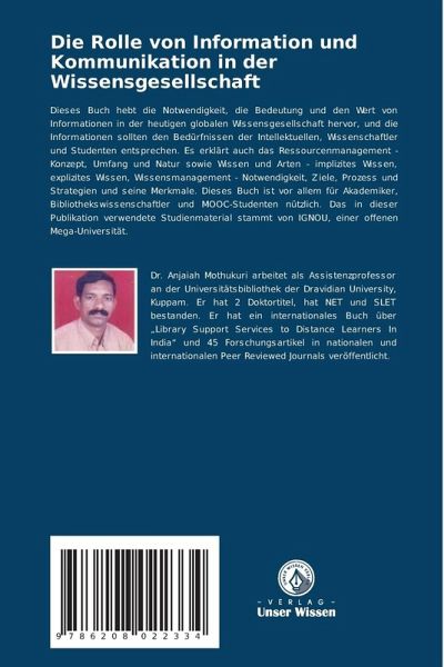 Dieses Buch hebt die Notwendigkeit, die Bedeutung und den Wert von Informationen in der heutigen globalen Wissensgesellschaft hervor, und die Informationen sollten den Bedürfnissen der Intellektuellen, Wissenschaftler und Studenten entsprechen. Es erklärt auch das Ressourcenmanagement - Konzept, Umfang und Natur sowie Wissen und Arten - implizites Wissen, explizites Wissen, Wissensmanagement - Notwendigkeit, Ziele, Prozess und Strategien und seine Merkmale. Dieses Buch ist vor allem für Akademiker, Bibliothekswissenschaftler und MOOC-Studenten nützlich. Das in dieser Publikation verwendete Studienmaterial stammt von IGNOU, einer offenen Mega-Universität.