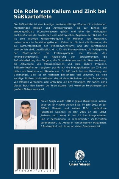 Die Süßkartoffel ist eine krautige, zweikeimblättrige Pflanze mit kriechenden, mehrjährigen Ranken und Adventivwurzeln, die zur Familie der Windengewächse (Convolvulaceae) gehört und eine der wichtigsten Knollenpflanzen der tropischen und subtropischen Regionen der Welt ist. Sie ist eine wichtige Kohlenhydratquelle für Millionen von Menschen, insbesondere in Entwicklungsländern. Kalium ist für fast alle Prozesse, die zur Aufrechterhaltung des Pflanzenwachstums und der Fortpflanzung erforderlich sind, unerlässlich, d. h. für die Photosynthese, die Verlagerung der Photosynthese, die Proteinsynthese, die Kontrolle des Ionengleichgewichts, die Regulierung der Spaltöffnungen, die Aufrechterhaltung des Turgors, die Stresstoleranz und die Wassernutzung, die Aktivierung von Pflanzenenzymen und viele andere Prozesse. Süßkartoffelpflanzen reagieren positiv auf die Blattapplikation von Zink und bilden ein Maximum an Wurzeln aus. Es hilft auch bei der Behebung von Zinkmangel. Zink ist ein wichtiger Bestandteil von Enzymen, die viele wichtige Stoffwechselreaktionen, die mit dem Wachstum und der Entwicklung von Pflanzen verbunden sind, antreiben und beschleunigen. Wir hoffen, dass dieses Buch den Lesern bei ihren Studien und weiteren Forschungen von großem Nutzen sein wird.