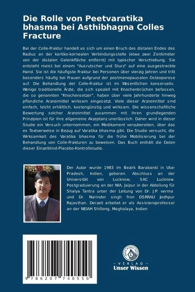 Bei der Colle-Fraktur handelt es sich um einen Bruch des distalen Endes des Radius an der kortiko-kornealen Verbindungsstelle (etwa zwei Zentimeter von der distalen Gelenkfläche entfernt) mit typischer Verschiebung. Sie entsteht meist bei einem "Ausrutscher und Sturz" auf eine ausgestreckte Hand. Sie ist die häufigste Fraktur bei Personen über vierzig Jahren und tritt besonders häufig bei Frauen aufgrund der postmenopausalen Osteoporose auf. Die Behandlung der Colle-Fraktur ist im Wesentlichen konservativ. Wenige traditionelle Ärzte, die sich speziell mit Knochenbrüchen befassen, die so genannten "Knochensetzer", haben über viele Jahrhunderte hinweg pflanzliche Arzneimittel wirksam eingesetzt. Viele dieser Arzneimittel sind einfach, leicht erhältlich, kostengünstig und wirksam. Die wissenschaftliche Bewertung solcher Arzneimittel zusammen mit ihren grundlegenden Prinzipien ist für ihre allgemeine Akzeptanz unerlässlich. Daher wird in dieser Studie ein Versuch unternommen, ein Medikament vorzubereiten, über das es Textverweise in Bezug auf Varatika bhasma gibt. Die Studie versucht, die Wirksamkeit des Varatika bhasma für die frühe Mobilisierung bei der Behandlung von Colle-Frakturen zu beweisen. Das Buch enthält die Daten dieser Einzelblind-Placebo-Kontrollstudie.