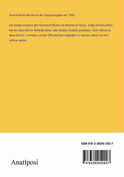 Unveränderter Nachdruck der Originalausgabe von 1853. Der Verlag Anatiposi gibt historische Bücher als Nachdruck heraus. Aufgrund ihres Alters können diese Bücher fehlende Seiten oder mindere Qualität aufweisen. Unser Ziel ist es, diese Bücher zu erhalten und der Öffentlichkeit zugänglich zu machen, damit sie nicht verloren gehen.