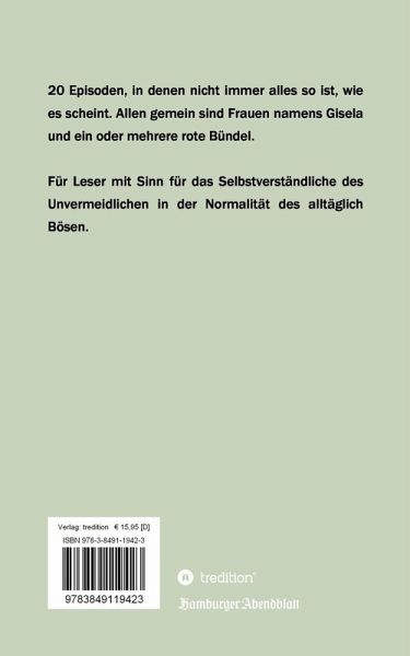 In 19 Episoden markieren rote Bündel jeweils Wendepunkte im Leben der Protagonisten, deren Erzählstränge in der 20. Episode zusammenlaufen. Allen Episoden gemein sind Frauen namens Gisela und ein oder mehrere rote Bündel in Form von geknoteten Lederbündeln, Plastikbündeln, Samtbündeln, überdimensionalen Handtaschen mit sehr verschiedenem Inhalt, aber auch in Form von Schwimmwestenbündeln, Bahnhofsnamen und blutigen Männerköpfen.Was eint eine Spaziergängerin, deren Hund ständig wegläuft und eine Kleingärtnerin ohne Mann - eine junge Psychologin mit nicht ganz legalem Abschluss und eine Chirurgin, die Seelen schneidet - einen kreativen Koch mit präparierten Froschleichen und fünf rot gekleidete Damen, die sich auf einem Bahnhof treffen - eine Drehbuchautorin, die kocht, ohne es zu können und einen Internatsschüler mit begnadetem Schauspieltalent? Eine erfolgreiche Drehbuchautorin, unabhängig und frei, fühlt plötzlich den Zug des Lebens ohne sich abfahren und will geheiratet werden.Egal von wem. Sie veranstaltet eine Party für ihre Freunde und einen Unbekannten, der am Ende des Abends auf dem Boden ihrer Küche liegt. Erschlagen von einer Ketchupflasche. Der Koch Tillmann Schneider wünscht sich nichts sehnlicher, als seine Ideen in die Tat umsetzen zu können, doch für seine Mutter ist er ein Versager, dessen Vater eine Koryphäe auf dem Gebiet der Erforschung giftiger Froschsekrete war. Als Tante Gisela ihren Besuch ankündigt und ihm seine heimliche Liebe aus der Schulzeit über den Weg läuft, kreiert Tillmann eine ganz besondere Abendmahlzeit. Eine alte Frau wäre gern Großmutter und ergreift die Gelegenheit beim Schopfe, als Trickbetrüger an ihrer Haustür mit einem kleinen Mädchen an der Hand erscheinen. Die beiden haben sich gesucht und gefunden. Das Schicksal hat es gut mit ihnen gemeint. Fünf Damen, die auf einen Gigolo reinfielen, haben sich aus ihren bisherigen Zwängen gelöst und beginnen gemeinsam ein neues Leben. Der Erpresser wird sie nie mehr belästigen und die Gestaltung ihres neuen Lebens beginnt vielversprechend.