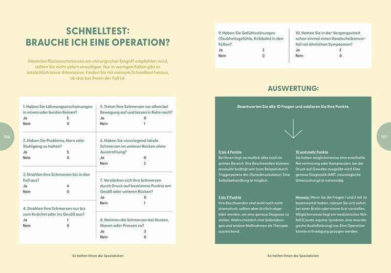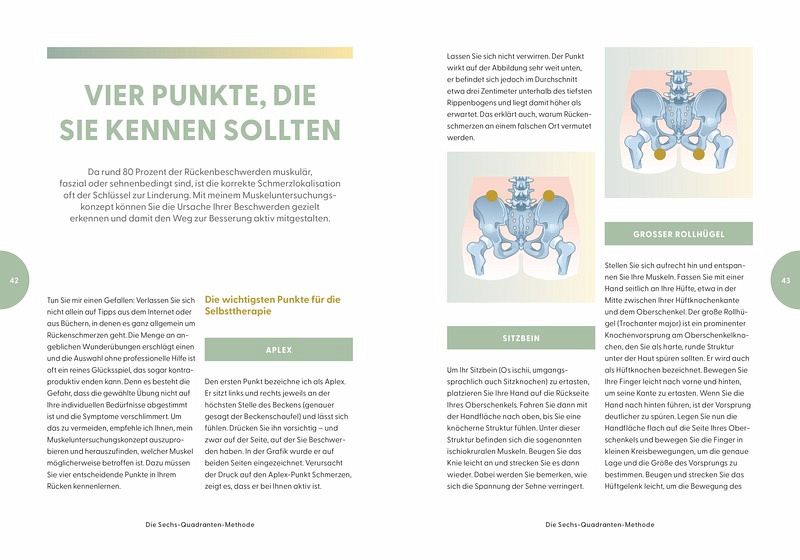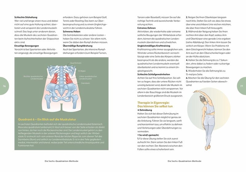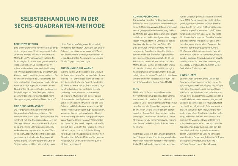 Aus diesen Erfahrungen entwickelte er die Sechs-Quadranten-Methode, ein innovatives Diagnosekonzept, das den Rücken in sechs Zonen unterteilt. Für jeden Quadranten werden typische Schmerzursachen beschrieben und konkrete Selbsthilfemaßnahmen vorgestellt. Anschauliche Abbildungen unterstützen die Leserinnen und Leser beim Verständnis. Besonders positiv hervorzuheben ist, dass der Autor nicht nur Eigenbehandlungen empfiehlt, sondern auch klar darauf hinweist, wann ein Arztbesuch notwendig ist.