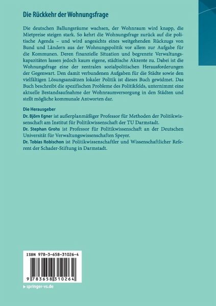 Die Rückkehr der Wohnungsfrage.- Stadtentwicklung und Wohnungspolitik - vom Nutzen einer Einbettung und Weitung wohnungspolitischer Ziele.- Wohnungspolitik als Sozialpolitik? Zum Wechselspiel von Haushaltslage, Sozialausgaben und kommunalen Investitionen in Wohnraum.- Zielkonflikte und Steuerungsmöglichkeiten der Kommunen bei der Anerkennung von Unterkunftsbedarfen im Rahmen der Grundsicherung.- Die ewig neue Wohnungsfrage! Auf den Spuren bundesdeutscher Debatten zur sozialen Wohnraumversorgung.- Baulandbedingte Versorgungsengpässe am Wohnungsmarkt - Folge einer "Demografisierung" der Baulandpolitik oder unvermeidbare Trägheit planungspolitischer Prozesse? Das Beispiel Frankfurt am Main.- Lokale Wohnungspolitik im Kontext sozioökonomischer Herausforderung und diskursiver Problemdeutung: Ein Städtevergleich.- Koordinierte Politik oder Policy-Fragmentierung? Wohnungs- und Stadtentwicklungspolitik in Wien und Washington, DC.- Lösungsansätze zwischen inzentivierender und regulativer Wohnungs- und Bodenpolitik aus kommunaler Sicht.
