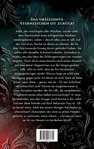 Das dreizehnte Sternzeichen ist zurück!Adrik, der mächtigste aller Wächter, wurde unter dem Deckmantel eines erfolgreichen Musikers wiedergeboren. Leben - das ist alles, was er will, und sein Ziel ist es, Rache an denen zu nehmen, die ihn über Jahrtausende hinweg daran gehindert haben. Sie sollten alle dasselbe Schicksal erleiden. Zumindest ist es das, was das Herz des Schlangenträgers am meisten begehrt. Doch als er eines Nachts nach einem Konzert auf eine seiner Gegnerinnen aus der Vergangenheit trifft, ahnt er nicht, dass sie ihm Verständnis entgegenbringen würde. Warum hegt sie solch eine Abneigung gegen jene, mit denen sie einst Seite an Seite stand, wenn diese - genau wie sie - für sein Schicksal verantwortlich sind? Könnte sie möglicherweise zu einer Komplizin werden, die ihm hilft, die zersplitterten Fragmente seines alten Selbst zurückzuholen? Er muss herausfinden, was den Hunger nach Rache in ihm nährt und wer diese fremde und doch bekannte Frau ist. Ob sie bereit wäre,Adrik bei seinem blutigen Racheplan zu unterstützen? Jemandem, der einst zu seinen Feinden gehörte, zu vertrauen, wäre riskant - und was ist, wenn sie ihn von Neuem ins Verderben stürzt?