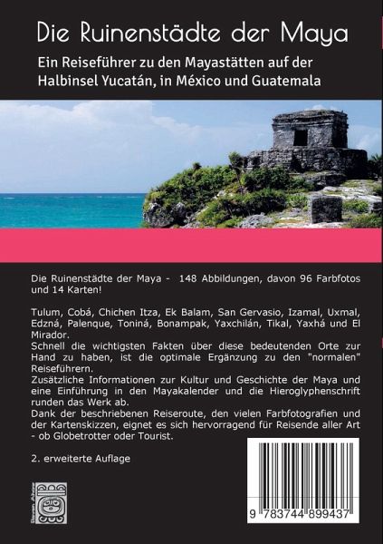 Die Ruinenstädte der Maya - Ein Reiseführer zu den Mayastätten auf der Halbinsel Yucatán, in México und Guatemala - 2. erweiterte Auflage - mit 96 Farbfotos und 15 Karten! Tulum, Cobá, Chichán Itzá, Ek Balam, San Gervasio, Izamal, Uxmal, Edzná, Palenque, Toniná, Bonampak, Yaxchilán, Tikal, Yaxhá und El Mirador. Das sind die Orte, die in diesem Reiseführer zu den berühmtesten Mayastätten beschrieben werden. Schnell die wichtigsten Fakten über diese bedeutenden Orte zur Hand zu haben, ist die optimale Ergänzung zu den "normalen" Reiseführern. Zusätzliche Informationen zur Kultur und Geschichte der Maya und eine Einführung in den Mayakalender und die Hieroglyphenschrift runden das Werk ab.Dank der beschriebenen Reiseroute, den vielen Farbfotografien und der Kartenskizzen, eignet es sich hervorragend für Reisende aller Art - ob Globetrotter oder Tourist.