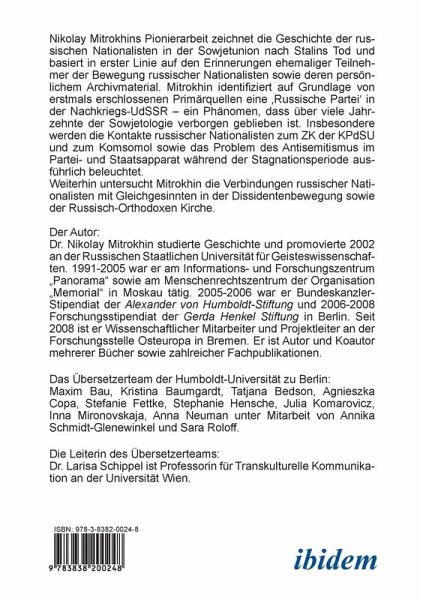 Nikolay Mitrokhins Pionierarbeit zeichnet die Geschichte der rus sischen Nationalisten in der Sowjetunion nach Stalins Tod und basiert in erster Linie auf den Erinnerungen ehemaliger Teilneh mer der Bewegung russischer Nationalisten sowie deren persön lichem Archivmaterial. Mitrokhin identifiziert auf Grundlage von erstmals erschlossenen Primärquellen eine "russische Partei" in der Nachkriegs-UdSSR - ein Phänomen, dass über viele Jahr zehnte der Sowjetologie verborgen geblieben ist. Insbesondere werden die Kontakte russischer Nationalisten zum ZK der KPdSU und zum Komsomol sowie das Problem des Antisemitismus im Partei- und Staatsapparat während der Stagnationsperiode aus führlich beleuchtet.