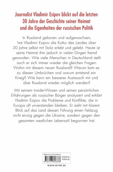 Vladimir Esipov blickt auf die letzten 30 Jahre der Geschichte seiner Heimat und erklärt manche Verhaltensmuster, die das westliche Publikum ratlos machen. Mit seinem Insider-Wissen analysiert er die russische Gesellschaft in einem Versuch, dem europäischen Publikum ein Land und seine Leute doch noch zu erklären, dessen Führung einen Kreuzzug nicht gegen die Ukraine, sondern gegen den ganzen westlichen Lebensstil begann.