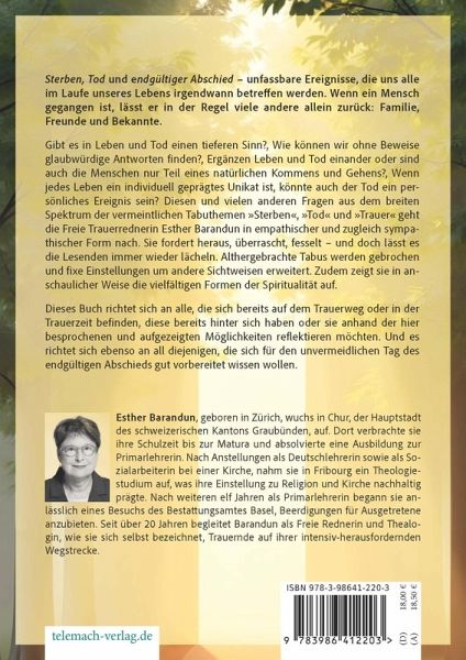 Esther Barandun, geboren in Zürich, wuchs in Chur, der Hauptstadt des schweizerischen Kantons Graubünden, auf. Dort verbrachte sie ihre Schulzeit bis zur Matura und absolvierte eine Ausbildung zur Primarlehrerin. Nach Anstellungen als Deutschlehrerin sowie als Sozialarbeiterin bei einer Kirche, nahm sie in Fribourg ein Theologiestudium auf, was ihre Einstellung zu Religion und Kirche nachhaltig prägte. Nach weiteren elf Jahren als Primarlehrerin begann sie anlässlich eines Besuchs des Bestattungsamtes Basel, Beerdigungen für Ausgetretene anzubieten. Seit über 20 Jahren begleitet Barandun als Freie Rednerin und Thealogin, wie sie sich selbst bezeichnet, Trauernde auf ihrer intensiv-herausfordernden Wegstrecke.