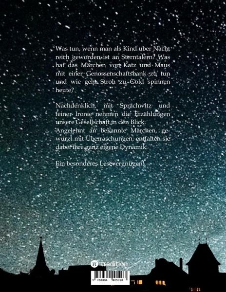 Was tun, wenn man als Kind über Nacht reich geworden ist an Sterntalern? Was hat das Märchen von Katz und Maus mit einer Genossenschaftsbank zu tun und wie geht Stroh zu Gold spinnen heute? Nachdenklich, mit Sprachwitz und feiner Ironie nehmen die Erzählungen unsere Gesellschaft in den Blick. Angelehnt an bekannte Märchen, gewürzt mit Überraschungen, entfalten sie dabei ihre ganz eigene Dynamik. - Ein besonderes Lesevergnügen!